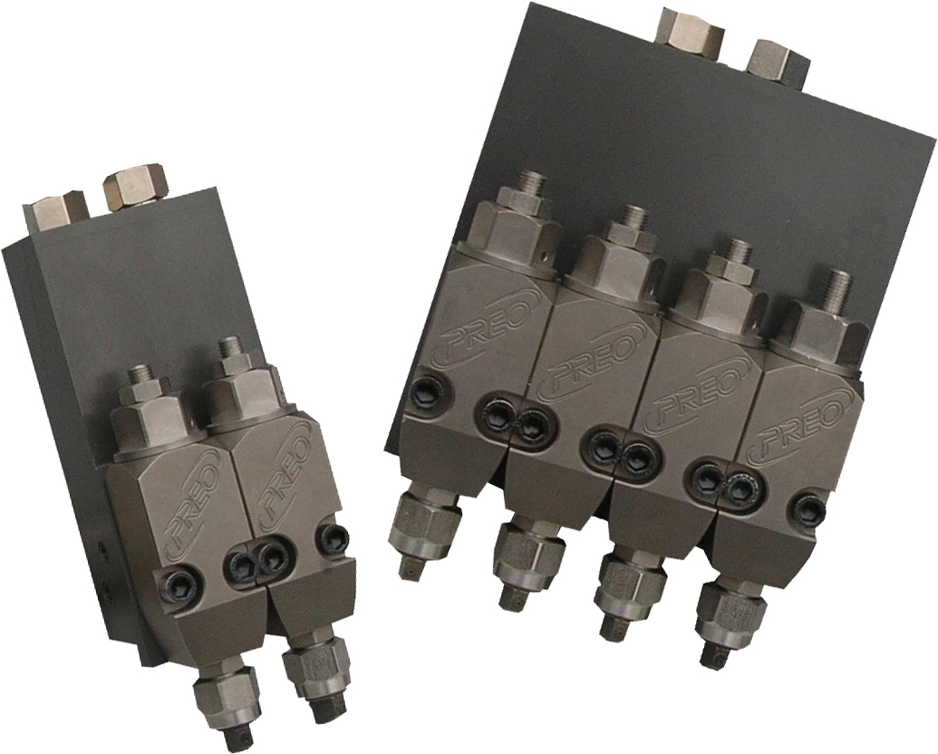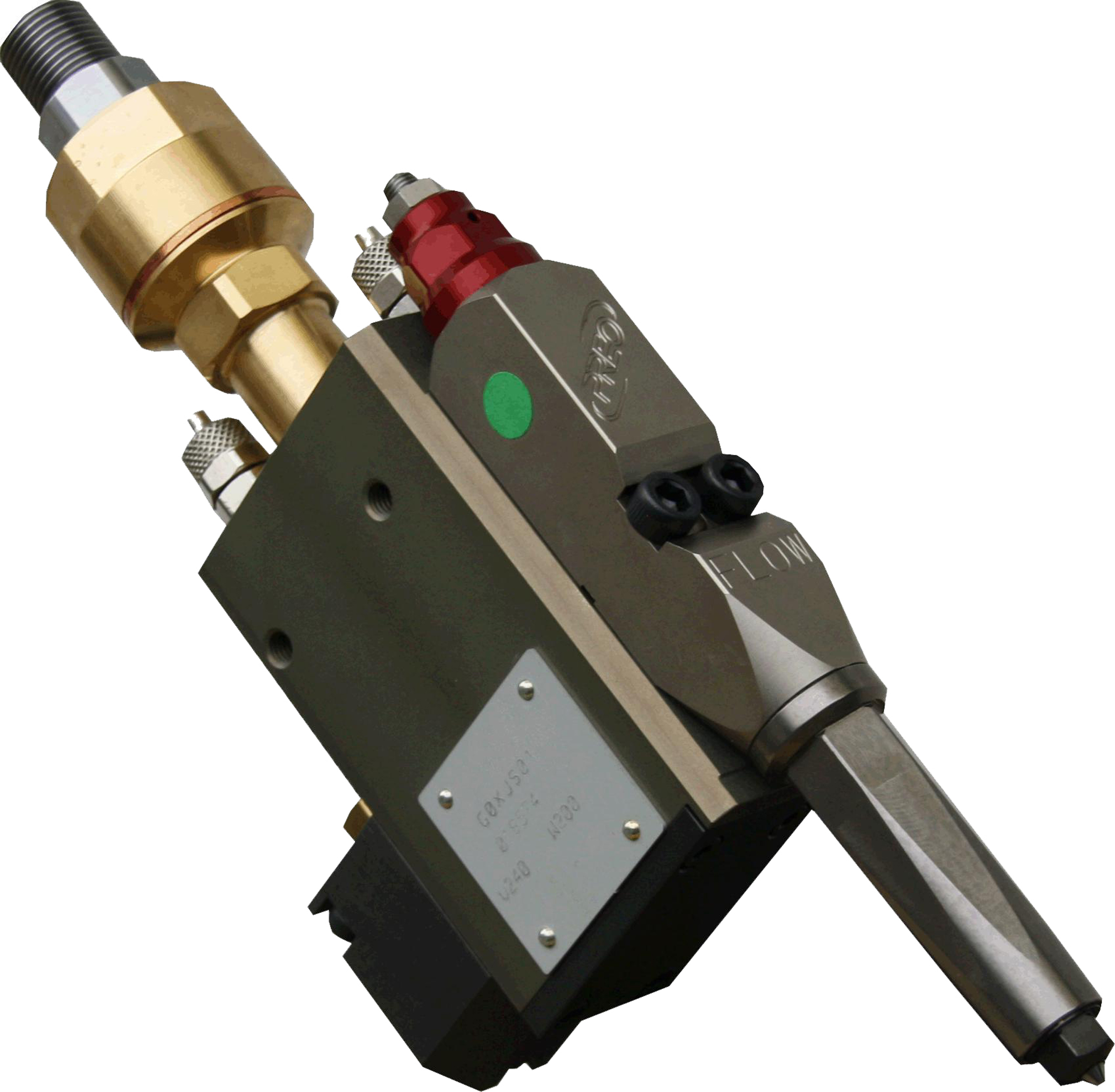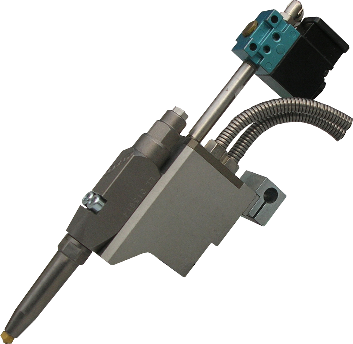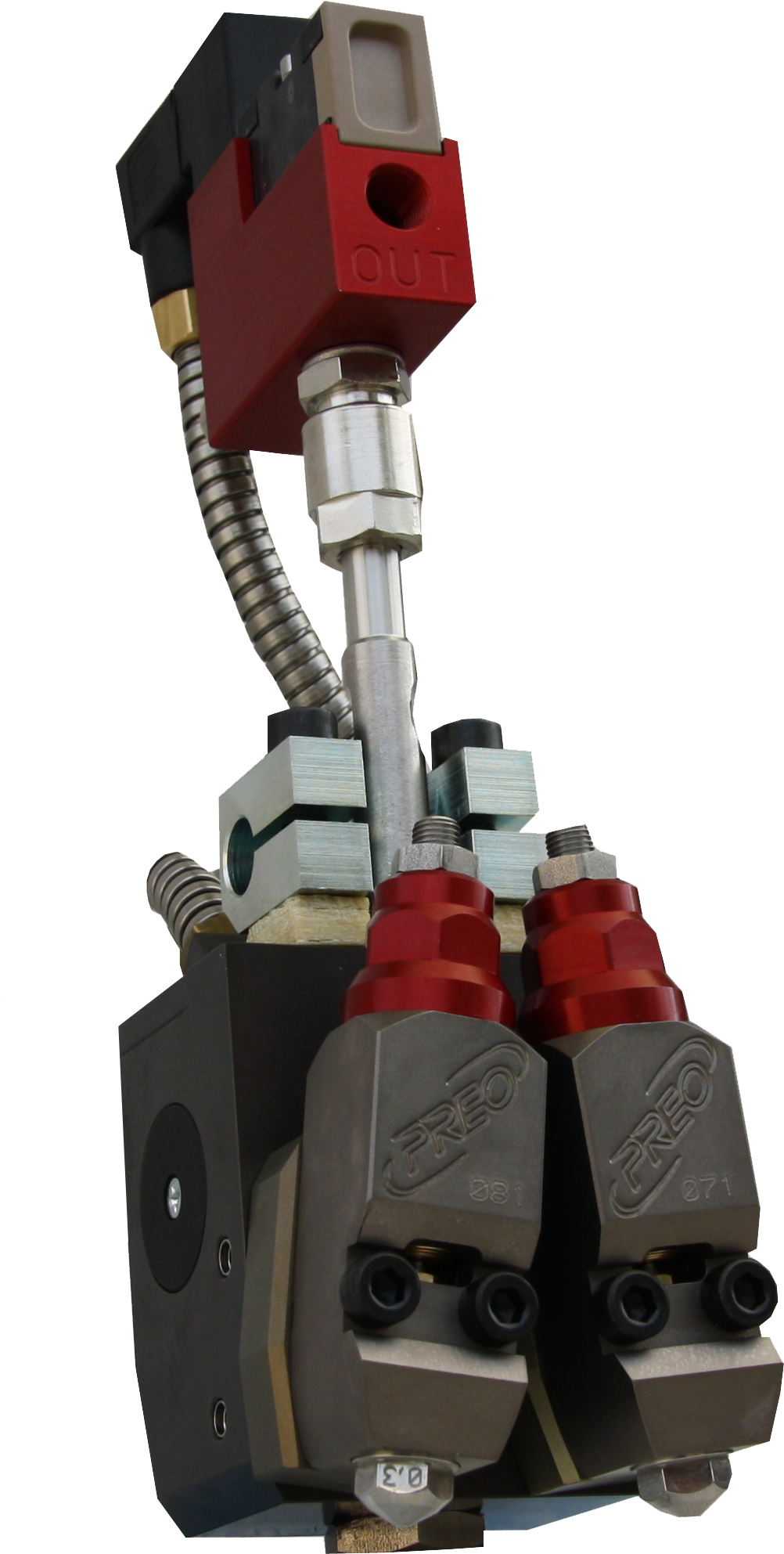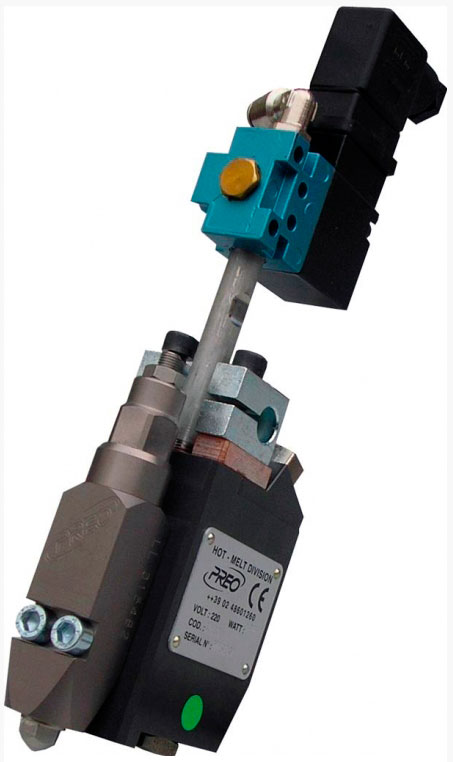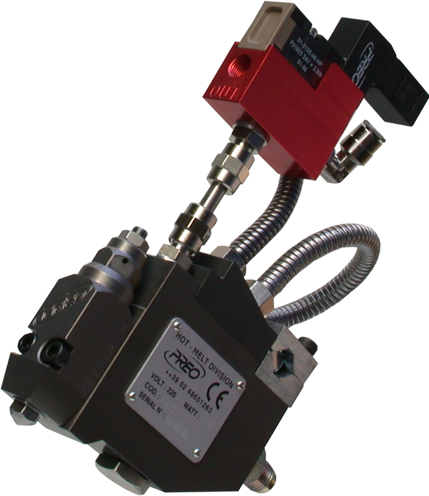PISTOLAS AUTOMÁTICAS - FLOW    A formação de fios, conhecido como "Angel Hair", é um dos principais problemas observado durante a aplicação de cola hotmelt de alta viscosidade, especialmente PUR. Graças à longa e vasta experiência da PREO neste sector, foram desenvolvidas as pistolas automáticas da Série FLOW, que não reduz apenas o problema mas elimina-o totalmente. As pistolas da Série FLOW estão patenteadas: a agulha de metal duro é especificamente perfurada ao longo de seu eixo, permitindo, através do fornecimento de um pequeno fluxo de ar, eliminar a cola residual do bico que, de outra forma, poderia sujar o produto final. Indicadas para aplicações automáticas e robotizadas, as pistolas da Serie FLOW podem ser usadas com bicos de 3 - 4 mm e estão equipadas com tecnologia Zero-Cavity (efeito auto-limpeza).            |